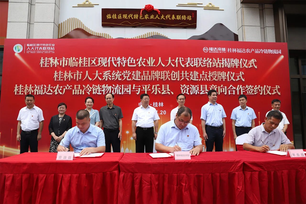 7月20日,桂林市临桂区现代特色农业人大代表联络站揭牌仪式和桂林市人大系统党建品牌联创共建点授牌仪式在桂林福达农产品冷链物流园举行。桂林市人大常委会副主任李滨,桂林市人大常委会机关党委书记、副秘书长郑钧洪,临桂区人大常委会主任易立林,临桂区委副书记谢静,临桂区人大常委会机关党支部书记周汝吉,福达集团党委书记、董事长黎福超出席仪式,桂林市人大、临桂区人大、平乐县人大、资源县人大、福达集团有关部门领导和桂林福达冷链干部员工参加仪式。