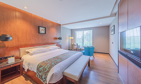 酒店占地面积约1000余平方米,楼高7层,客房总数99间(套),客房面积从33-85平米不等。对于客房的设计,灵活的规划空间,整片无框的玻璃飘窗借由窗外美景使房间更加的贴近自然。房间配色以大地色系为主,营造安心和舒适的氛围,简约的空间布局让室内显得宽敞通透。